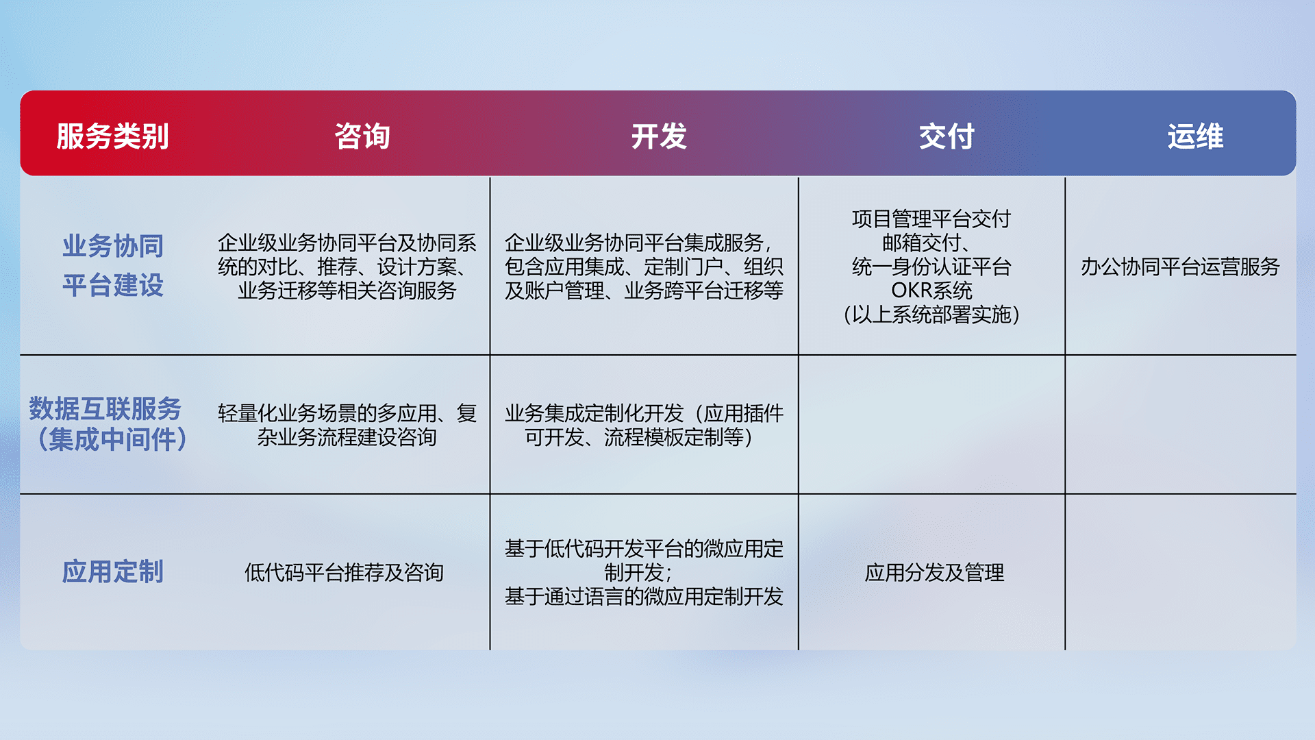 针对钉钉、、、、企微、、、、IDaas等平台级产品提供产品的规划、、、方案、、交付、、定制化开发等服务,,,,实现如统一协同办公、、智能客户服务、、、混合会议管理、、、智能数据查询、、、、等业务场景,,实现数字化转型。。